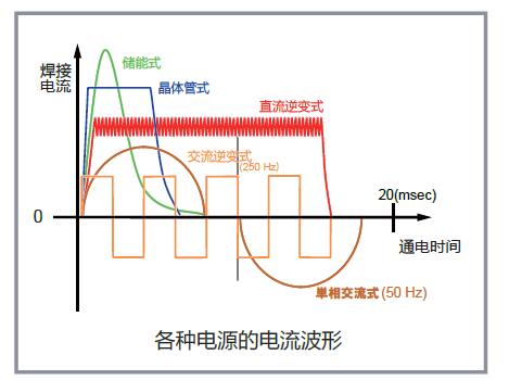 首先我們來看電池焊接過程中的主要注意問題,因為普通的電池點焊機焊接電源采用的是電容儲能式焊接電源,它的特點是電流上升速度快,但是沒有辦法控制它的最大電流輸出,沒有辦法控制它的輸出時間,所以精度不高。蘇州威爾達焊接設備有限公司生產的電池點焊機,采用的是晶體管焊接電源,它在電容儲能式焊接電源的基礎上,增加了MOSFET開關,頻率可以做到二百萬赫茲,這樣可以有效地控制電容的充電與放電,可以控制電池點焊機在放電的過程中的輸出波形。請參考如下各種電源的放電波形圖: