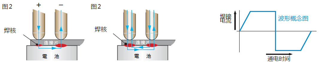 其次,電池點焊機在電池焊接過程中會產生霍爾效應,電流在流經平行電極的過程中,由正極流經負極,在正極堆積的能量更多,會產生一個焊點大,一個焊點小的特點。為了克服這個效應,蘇州威爾達焊接設備有限公司特別針對電池的焊接,開發了新型的正反波極性切換性晶體管式焊接電源,首先輸出一個正波,然后再輸出一個反波。具有交流電的效果,但是頻率在二百萬赫茲,所以控制精度遠遠高于交流電源。可以有效地克服極性效應,使左右兩個焊點達到平衡。可以參考原理圖: